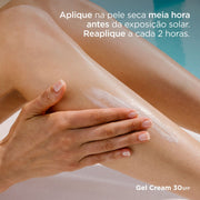 Protetor solar de textura gel creme, disponível com SPF 50 e SPF 30. Fotoprotetor corporal em gel creme, que hidrata como um creme e refresca como um gel.