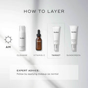 - Após a limpeza e aplicação do sérum, de manhã e à noite, aplica uma pequena quantidade no rosto, pescoço e decote — evitando a zona delicada do contorno dos olhos.
